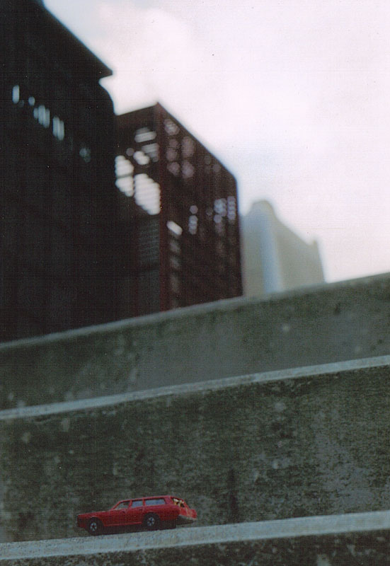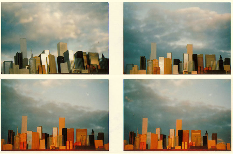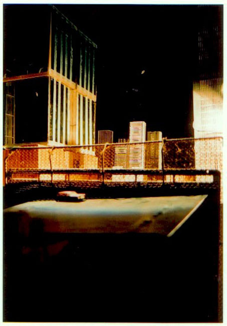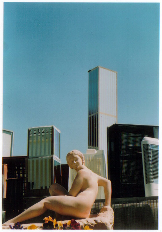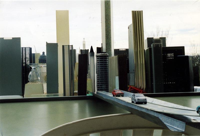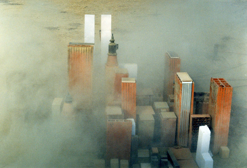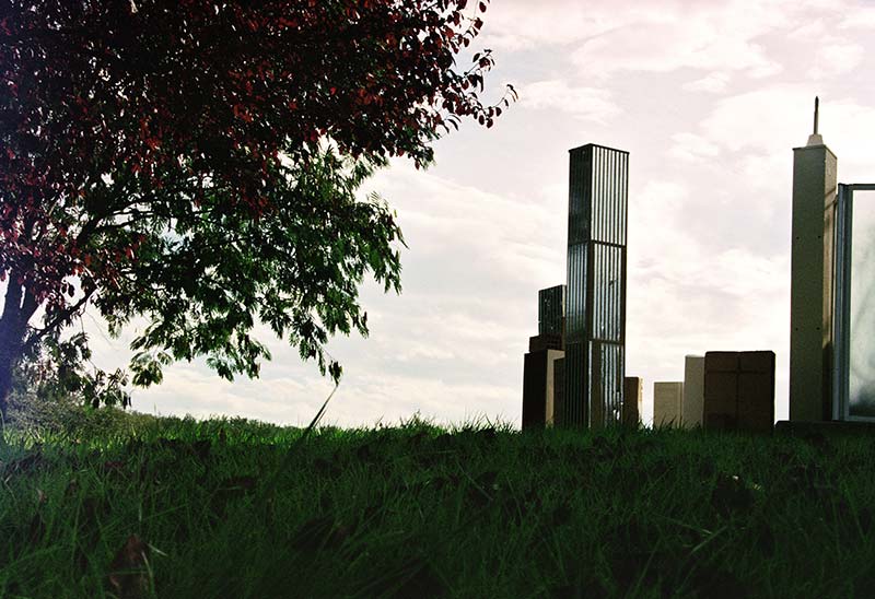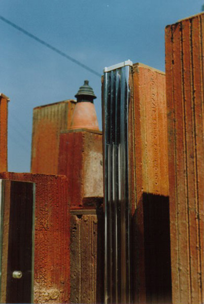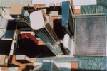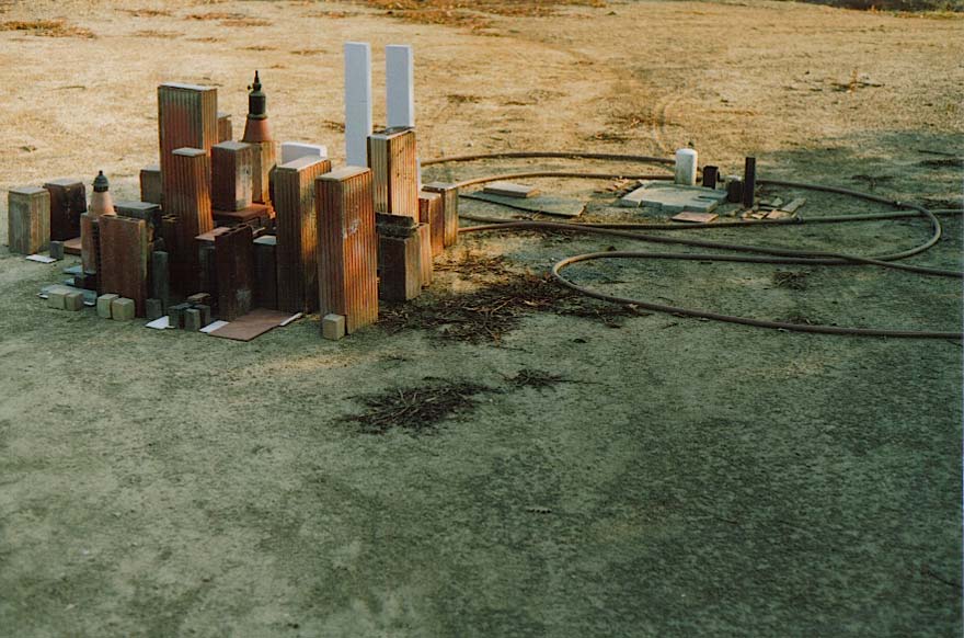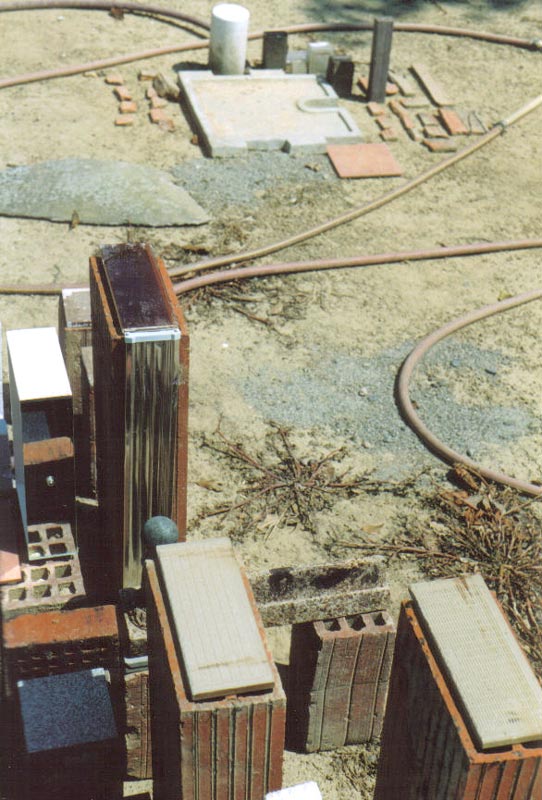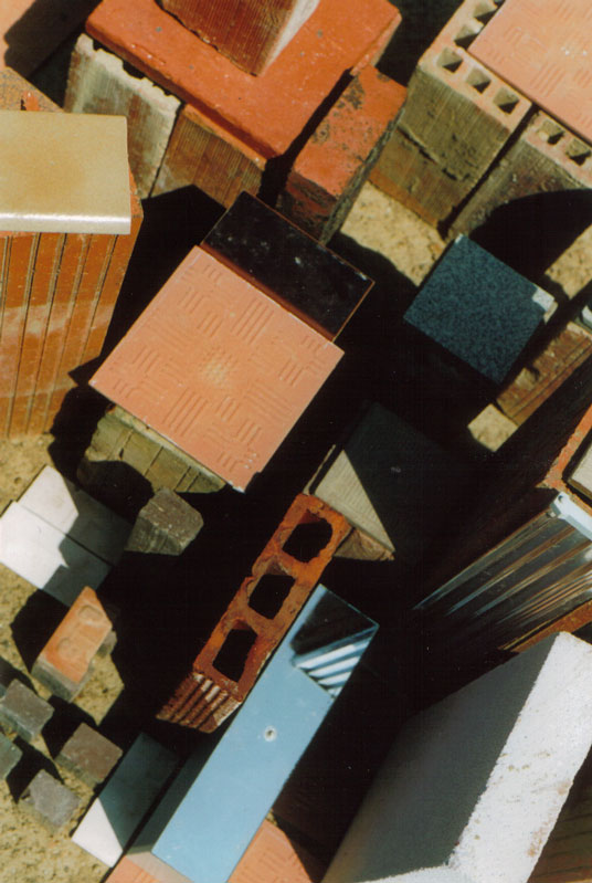 Prises de vue en extérieur d'installations d'objets et matériaux divers: briques, parpaings, siporex, carrelages, rails pour diapositives, boites, cederoms, guirlandes lumineuses,voitures miniatures, cageots en plastiques et en bois peint, hotte pour cuisine, radiateur électrique , panier et étendoir à linge, statuettes en plâtre, mosaïque miroir.
